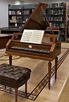 The center has several musical instruments on display: an original 1827 Viennese fortepiano, a reproduction of a 1795 Dulcken fortepiano, a clavichord, and a harpsichord.[5] The Dulcken fortepiano, which has a range of 5 octaves over 66 keys, is a copy of an original held by the Smithsonian Institution.[9] Visitors are allowed to play the Dulcken fortepiano, clavichord and harpsichord.