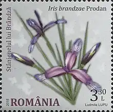- ↑ "Stamp catalog : Stamp ‹ Spuria Iris (Iris sintenisii subsp. brandzae)". colnect.com. Retrieved 20 February 2015.
