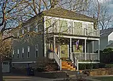 The William A. Spencer House at 47 Irvine Park was built 1856–1857 in a variant of pioneer Greek Revival architecture in which the roofline is parallel to the street. The two-story veranda is a later addition.[6] |