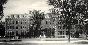 The first question 'put to the house' in 1869 was "Resolved, the erection of a theatre was not in the interest of promoting correct morals within the University community." The answer was nodded in the affirmative.[3] The Irving was not to be the venue for the theatre arts at Cornell. Beginning in February 1870, the Irving and the Philaletheian held their annual contest against each other. That event has been noted as one reason the quality of debate was so high between 1869 and 1884.[6] Initially, the Irving's proceedings were held on Friday evenings at Deming Hall, on what is now the Ithaca Commons.[7] Special events were held at the Cornell Public Library around the corner. Later it shared Society Hall with the other literary societies at Cornell. The Irving was initially a male-only society, but following the lead of Cornell's Curtis Literary Society (founded in 1872), membership in the Irving became open to women students and remained so throughout its existence.[8] In 1873, members of the Curtis, Irving and Philaletheian societies jointly founded and ran the Cornell Review, "a repository of original articles, essays, stories, Woodford orations, elaborate discussions, and poems."[9]