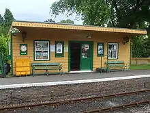 Following its closure in 1969 the track was removed in 1970 and the station remained neglected and overgrown gradually being covered by a shroud of trees and grass. After fourteen years of disuse, it was auctioned on 14 June 1983 by British Rail and sold for £60,500 to Dave and Gwen Milham who operated a landscaping business in the area and had attended the auction merely out of curiosity.[4] A first inspection of the station site revealed a 3-foot (0.91 m) high carpet of grass on the platforms and trees up to 20-foot (6.1 m) high flourishing on the down line. The Saxby & Farmer signalbox was structurally sound, as was the main booking hall area which nevertheless needed new ceilings and windows, and part of the slate roof had to be relaid. However, in less than 18 months the station had been transformed back into a period working station bearing the green and yellow colours of the Southern Railway which had taken over the Wealden Line in 1923.[5]