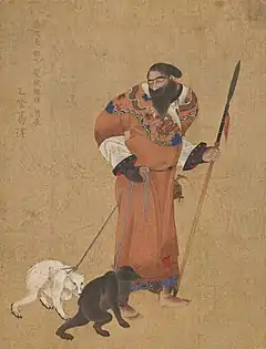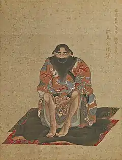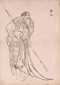 | Chousama (超殺麻), chieftain of Urayasubetsu | with European stockings and shoes under his fur-lined Ezo nishiki robe,[4]: 100 he wears blue bead and cloth tassel earrings and holds a hoe-shaped helmet ornament[1]: 121 (as does the chieftain Tobu in Kakizaki Hakyō's 1783 portrait (see Gallery below)) | ![]() | |