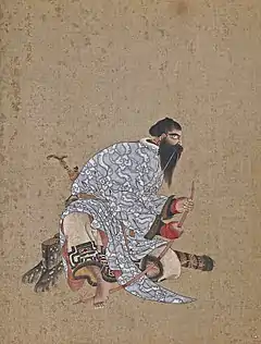 | Mautarake (麻烏太蠟潔), chieftain of Urayasubetsu | with his sanpaku eyes, he sits on bear[10]: 158 or sea otter[11][1]: 121 skins, his Ezo nishiki robe — with dragons, clouds, and waves, worn right over left — rides up, revealing his hairy legs; in his hands is an item of jewellery with tassels and beads[10]: 158 | ![]() | ![]() |
