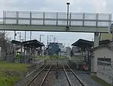 The station has two opposed side platforms, connected to the station building by both a level crossing and a footbridge.