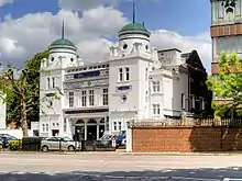 The centre is housed in the former Maida Vale Picture House, a 1,001-seat cinema designed by Edward A. Stone (one of his earliest works)[19] which opened as the Picture Palace on 27 January 1913.[20] The building has two copper-topped towers and a central dome; the auditorium, with oak walls decorated with gilded plaster,[19] originally had a small circle with curtained boxes, and an entrance vestibule with a marble floor and an open fire, with a tearoom above it. Provincial Cinematograph Theatres acquired it in 1920 and renamed it the Picture House in 1923. It was in turn acquired in 1927 by Associated Provincial Picture Houses, who reopened it that September with a new organ, and in 1929 by Gaumont British Theatres, who closed it in November 1940 because of the Second World War. In 1949, after alterations, it was reopened by Mecca Dancing as the Carlton Rooms, a ballroom which was the location of BBC dancing broadcasts. It was converted again into a bingo club[21] in 1961 and became a Grade II listed building in 1991.[22] Jasmine Bingo, the then operator, closed it in 1996.[20]