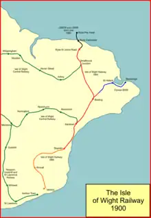 The Isle of Wight Railway was a railway company on the Isle of Wight, United Kingdom; it operated 14 miles (23 kilometres) of railway line between Ryde and Ventnor. It opened the first section of line from Ryde to Sandown in 1864, later extending to Ventnor in 1866. The Ryde station was at St Johns Road, some distance from the pier where the majority of travellers arrived. A tramway operated on the pier itself, and a street-running tramway later operated from the Pier to St Johns Road. It was not until 1880 that two mainland railways companies jointly extended the railway line to the Pier Head, and IoWR trains ran through, improving the journey arrangements.