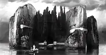 For two years, Rachmaninoff looked for inspiration for a symphonic poem, and in November 1906, he wrote to his friend Nikita Morozov, seeking ideas for a subject for such a work, but was uninspired by his suggestions.[1] Then, in Paris in May 1907, he saw a black and white reproduction of Arnold Böcklin's painting Isle of the Dead, and, inspired by the painting, he used it as the basis for his symphonic poem, on the suggestion of his friend Nikolai Struve.[2][3] He composed the piece from January to March of 1909, with the work's manuscript dated to 17 April,[4] the day before it received its premiere in Moscow, under the composer's baton.[5] Rachmaninoff was disappointed by the original painting when he later saw it, saying, "If I had seen first the original, I, probably, would have not written my Isle of the Dead. I like it in black and white."[6]