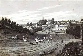 View of Islip from the south, published in 1823 in John Dunkin's Oxfordshire. The History & Antiquities of the Hundreds of Bullington & Ploughley. It shows the four-arch bridge over the River Ray that in 1878 was demolished and replaced by the present three-arched one.[9]