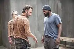 In the inner courtyard, Tyreese explains to Rick Grimes, Carol Peletier, and Daryl Dixon how he found the burned corpses of his girlfriend Karen and friend David. An enraged Tyreese demands that Rick find the killer; when Rick and Daryl try to calm him down, he turns violent and begins to attack them. During this, Rick flies into a rage and badly beats Tyreese before Daryl pulls Rick off.