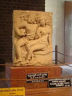 The museum exhibits some valuable pieces of sculptures found in vihara premises.[2] The most famed sculpture amongst them is the Gupta styled carving of Isurumuni lovers which belongs to the 5th century. It is believed to have been found from the royal pleasure garden.[3] The other significant stone sculptures in the museum are the royal court (or the royal family), the Kavata sculptures, Kuvera Triod, Sculptures of Kinnaras and figures of dwarves.