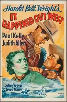 It Happened Out West is a 1937 American Western film directed by Howard Bretherton and written by Earle Snell and John Roberts. The film stars Paul Kelly, Judith Allen, Johnny Arthur, LeRoy Mason, Lew Kelly, and Russell Hicks. The film was released on May 2, 1937, by 20th Century Fox.[1][2][3]