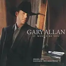 "It Would Be You" is a song written by Kent Robbins and Dana Hunt Black and recorded by American country music artist Gary Allan. It was released in February 1998 as the first single and title track from Allan's 1998 album of the same name. It reached No. 7 on the U.S. Billboard Hot Country Singles and Tracks chart, remaining in the Top 10 after 21 weeks of radio play. As a result, this song became Allan's second Top 10 hit on the country charts, after his debut single "Her Man" in 1996–1997, which also reached No. 7.