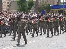 The first Bersaglieri fanfare band was born on 1 July 1836, when a department left the Ceppi barracks in Turin with wind instruments together with their weapons.[3] The meeting for the musical training of the trumpeters of the various companies gave rise to the battalion fanfare band, which in a few years became an independent unit, while serving the individual companies that also continued to have their own trumpeters. Over time, other wind instruments were added in addition to the trumpets. At this time, the fanfara also began its tradition of marching at a jogging pace. According to popular tradition, the use derives from the entrance in Rome to the breach of Porta Pia in 1870, which was to take place at a charge pace, but which instead spontaneously became a race for the soldiers.