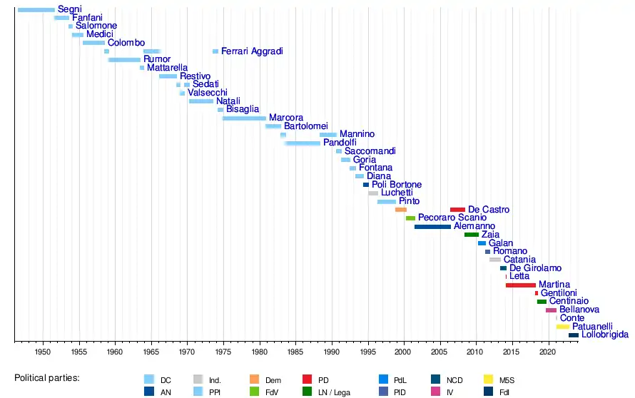 6 July 1955 | 1 July 1958 | 2 years, 360 days | Christian Democracy | Segni I Zoli |