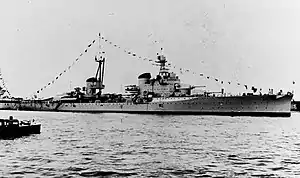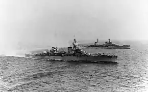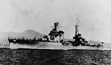 Upon Italy's entrance into the Second World War on 10 June 1940, Bolzano was assigned to the 2nd Division in the 2nd Squadron, along with the two Trento-class cruisers.[4] On 9 July, the ship took part in the Battle of Calabria; there, she led the line of Italian heavy cruisers as they engaged their British counterparts. She was hit by a salvo of three 6-inch (152 mm) shells at 16:05 that killed two crewmen and jammed her rudder to port, forcing her to turn in a tight circle. The shells also hit her forward superfiring gun turret, though it was still able to fire.[3][5] The hits had come from the light cruiser HMS Neptune.[6] After the two fleets disengaged, Italian aircraft misidentified the ship as a British vessel and attacked her, though they failed to score any hits. She reached La Spezia on 12 July, where her battle damage was repaired. By the night of 1112 November, Bolzano had been moved to Taranto; she was present during the raid on Taranto that night, but was not attacked by the British torpedo bombers.[3] A wave of horizontal bombers was tasked with attacking Bolzano and the two Trentos, but their captains decided to hold their fire; as a result, the British aircraft were unable to locate the three cruisers in the darkness and they attacked other vessels.[7]