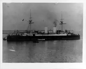 Ettore Fieramosca and Vesuvio were sent to China in 1900 to assist the Eight-Nation Alliance in putting down the Boxer Uprising there.[4] Ettore Fieramosca returned to Italy and made a cruise off East Africa in 1905. She then sailed across the Atlantic and made a number of port visits in South America.[4] The ship was then assigned to the American Squadron and refitted in Boston in November 1906.[10] During the cruiser in North American waters, Rear Admiral Roberto Cali was aboard the ship. Later that month, she visited Philadelphia, where several of her officers, including Cali, attended a celebration for Admiral George Dewey of the US Navy on 30 November.[11] In 1908 she visited Bridgeport, Connecticut in the United States for celebrations on Columbus Day. There, bluejackets from Ettore Fieramosca and the US pre-dreadnought battleship USS New Hampshire marched in a parade.[12] Upon her return to Italy in 1909 Ettore Fieramosca was struck off the naval register on 15 July 1909 and sold for scrap.[4][1]