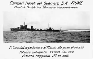 Daniele Manin was laid down by Cantieri navali del Quarnaro at their Fiume shipyard on 9 October 1924, launched on 15 June 1925 and commissioned on 1 March 1927.[1]