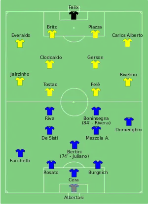 In 1970, the Brazilian team featured superstars like Pelé, Rivellino, Jairzinho and Carlos Alberto and were considered favourites for the title. Particularly in the second half, the Italians were outclassed by the Brazilians passing play.