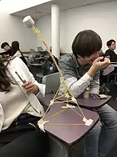 Observation and studies of participants show that kindergartners are regularly able to build higher structures, in comparison to groups of business school graduates. This is explained by the tendency for children to at once stick the marshmallow on top of a simple structure, test the prototype, and continue to improve upon it. Whereas, business school students tend to spend time vying for power, planning, and finally producing a structure to which the marshmallow is added.[7] The challenge helps to build and develop prototyping, teamwork, leadership and innovation skills and is a popular STEM activity. The challenge was invented by Peter Skillman of Palm, Inc. and popularized by Tom Wujec of Autodesk.[8][9][10][11][12]