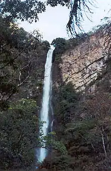The Itiquira Falls is a waterfall in Brazil. They are located 34 kilometers north of Formosa in the state of Goiás and 115 kilometers from Brasília on a paved road.[1] The falls have a height of 168 meters, making them possibly the highest accessible waterfall in Brazil and the second highest overall. The falls are formed by the drop of the Itiquira River from the higher central plateau north of Formosa into the deep Paranã River valley. The waters are unpolluted and a bottling plant is located on the river above the falls (access from a different road heading north from Formosa towards Planaltina de Goiás).