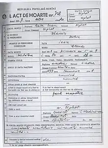 Iuliu Maniu died in 1953 in Sighet Prison, and his body was thrown into the common grave in the courtyard. The official death certificate listed his occupation as "unemployed", and the death cause as circulatory failure and chronic myocarditis.