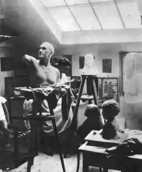 Iva Simonović was born in Hrastovica near Petrinja in Croatia-Slavonia, Austria-Hungary, on 15 August 1891.[1][lower-alpha 1] The Simonović family were wealthy. Her father, a general in the Austro-Hungarian Army, recognized her talent and provided her with an art education.[2] She was trained by the sculptors Robert Frangeš-Mihanović and Rudolf Valdec.[1] Her first exhibition, part of the solo exhibition of her peer Ljubo Babić, took place when she was still a student.[2] Babić was interested in her romantically and painted a portrait of her.[3] Iva Simonović continued her education in Paris and Munich, training as a plaquette and medallion artist, and had an exhibition in Paris in 1914.[1][2]