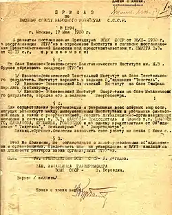 In 1930, the IVPI was liquidated and divided into separate institutes: on the basis of the Faculty of Chemistry, the Ivanovo Chemical-Technological Institute (IKhTI)[4] was created, on the basis of the Spinning and Weaving Institute - the Ivanovo Textile Institute. M. V. Frunze (IvTI),[5] on the basis of the Faculty of Agriculture - the Ivanovo Agricultural Institute (ISHI), on the basis of the Mechanical Engineering Faculty of the IVPI, the Ivanovo Power Engineering Institute (IEI) was formed.[6]