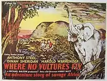 Where No Vultures Fly is a 1951 British adventure film directed by Harry Watt and starring Anthony Steel and Dinah Sheridan. It was released under the title Ivory Hunter in the United States.[2] The film was inspired by the work of the conservationist Mervyn Cowie.[3] The film's opening credits state that "the characters in this film are imaginary, but the story is based on the recent struggle of Mervyn Cowie to form the National Parks of Kenya."[4][5] The title Where No Vultures Fly denotes areas where there are no dead animals.[2] The film has a sequel, West of Zanzibar.[6]
