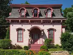The official National Register documentation for the Ivory McKusick House gives a construction date of 1868.[4] However more recent research from the Washington County Historical Society states that the house began as a one-story structure in 1866 and was enlarged in 1872 with the two-story wing that now serves as the main façade.[1] Second Empire architectural elements include the mansard roof with round-arched dormers, and numerous ornate brackets. These brackets adorn the window hoods on the dormers and the first floor, while even larger brackets with pendants support the wide eaves and the hood over the front door.[4] The heavy mansard roof was highly fashionable at the time.[1] A patterned frieze wraps under the roofline and is echoed in decoration around a bay window on the side elevation. Decorative elements are simpler on the original rear wing and lacking altogether on a two-story servants' wing added to the northwest corner of the house sometime before 1888.[4]
