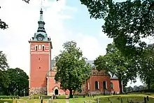 Jäder Church is a significant work of Swedish renaissance architecture, and is sometimes locally jokingly referred to as Rekarne domkyrka, "Rekarne Cathedral", owing to its unusually large size for a village church and extensive renaissance decorations. The church is situated on a hill surrounded by fields and built in stone and brick. It consists of a western nave, a choir of similar dimensions in the east, a sacristy to the north, the Brahe burial chapel opposite the sacristy to the south, a church porch and a western tower. The burial chapel and the sacristy form the arms of a latin cross. The walls have pointed arched windows, and the gabled roof is covered in roof slate. The western tower is crowned by a multi-levelled Neo-Renaissance spire.