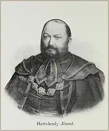 József Hertelendy ( 23 May 1833 – 31 August 1891) was politician, Lord-lieutenants of Torontál in Hungarian Kingdom,[1] Member of the House of Lords. Member of the Főrendház, received Order of Saint Stephen of Hungary.[2]