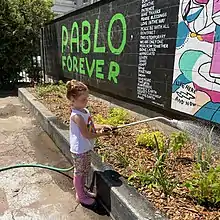 Young gardener waters at the Pablo Forever mural and garden planting at Washington Park Skatepark.