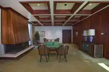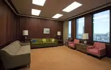 The building is perhaps best known for housing the offices of President Lyndon B. Johnson, who used 13 offices on the western half of the 9th floor while he was president of the United States.[4] The president's personal office, located in the northwest corner of the top floor, featured sweeping views of the city. The suite includes offices, a living space for the president, and a kitchen. All of the rooms are finished with dark stained-wood paneling and orange carpeting. At the president's request, almost every room had televisions to watch news broadcasts, including the restroom.[1] The president also requested high-pressure shower heads.