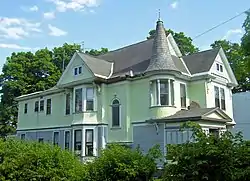 On the north, the profile is broken by a projecting bay as well, on both stories, supporting another gable with carved swag brackets. A nearby stair bay is lit by a round-topped stained glass window. The south elevation features an enclosed brick porch with corbeled columns supporting a frieze at the flared roofline. Another porch, this time wooden, is on the east (rear) facade, which offers a view over downtown Cohoes and the Hudson River.[1]
