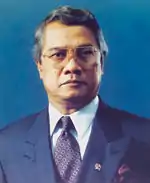 He was dismissed from office by Suharto's 11 February 1998 presidential decree but was not officially informed of the decision until six days later.[6] Although no reason was given, economists believed Djiwandono's opposition to a new fixed exchange rate system for the rupiah contributed to the decision for his dismissal.[7] The decision drew criticism from the International Monetary Fund and United States President Bill Clinton and placed a US$43 billion aid package at risk of being reversed.[8] He was succeeded by Syahril Sabirin in a transfer ceremony on 19 February.[9]