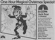 Jack Frost is a 1979 Christmas, Winter, and Groundhog Day stop motion animated television special produced by Rankin/Bass Productions.[2] It was directed by Jules Bass and Arthur Rankin, Jr., written by Romeo Muller, narrated by Buddy Hackett, and starring the voices of Robert Morse, Debra Clinger, and Paul Frees.[3] The special premiered on NBC on December 13, 1979, and tells the tale of Jack Frost and his adventures as a human.[4] It airs annually on AMC as part of its Best Christmas Ever programming block.
