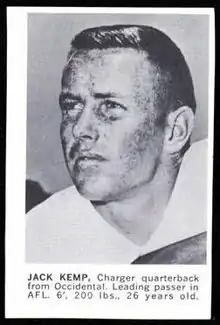 Before entering politics, Kemp was a professional quarterback for 13 years. He played briefly in the National Football League (NFL) and the Canadian Football League (CFL), but became a star in the American Football League (AFL). He served as captain of both the San Diego Chargers and Buffalo Bills and earned the AFL Most Valuable Player award in 1965 after leading the Bills to a second consecutive championship. He played in the AFL for all 10 years of its existence, appeared in its All-Star game seven times, played in its championship game five times, and set many of the league's career passing records. Kemp also co-founded the AFL Players Association, for which he served five terms as president. During the early part of his football career, he served in the United States Army Reserve.