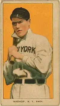 Warhop made his debut on September 9, 1908. He ended up with a 1–2 win–loss record with a 4.46 earned run average (ERA) in five games that year.[3] Warhop became a regular fixture in the starting rotation in 1909. He pitched a three hitter against the Cleveland Nats on August 10, 1909 and finished the year with a 13–15 win–loss record, a 2.40 ERA, and 21 complete games in 36 games pitched as the Highlanders finished fifth in the American League (AL).[3] However, Warhop led the AL in hit batsmen in 1909 (26) and 1910 (18), which might have been caused by his unorthodox pitching style.[3] In 1910, Warhop pitched to a 14–14 win–loss record, a 3.00 ERA and 11 errors (the most among AL pitchers).[3][9]:22 He was respected throughout baseball, and Baseball Magazine once called him the "unluckiest pitcher in the American League".[1]