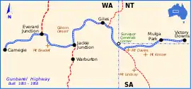 In May 1958 during survey work to determine the course of the Gunbarrel Highway, Beadell travelled through virgin scrub from Giles to Warburton, an existing Aboriginal mission station.[2] He selected the location approximately 65 kilometres (40 mi) north of Warburton as the commencement point for the next section of the Gunbarrel Highway. Survey westward from Jackie Junction took place from 14–28 May 1958, a road from Jackie Junction to Warburton was built in late August 1958, and construction of the final section of Gunbarrel Highway began on 3 September 1958 towards Carnegie Station. The road was completed on 15 November 1958.[3]