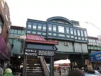 Triboro Coach leased the Victor Moore Arcade from Arnold Gumowitz for $1 a year until 1997.[79] The Metropolitan Transportation Authority (MTA) acquired the Victor Moore Arcade in March 1999, paying Gumowitz $9.5 million.[80] Later that year, the MTA began buying out 25 merchants' leases within the arcade in preparation for a $90 million renovation of the station complex.[81] The MTA planned to install four elevators, rebuild staircases, and erect the station's main entrance on the arcade's site.[79][82] At the time, the station was the second-busiest in Queens, but the bus terminal was too short to fit CNG-powered buses.[82] The arcade's layout was also inconvenient; bus passengers had to walk outside or through a bakery to access the subway, and passengers had to ascend to a mezzanine before they could access the underground Queens Boulevard Line platforms.[79] The passageways were also narrow and convoluted, causing congestion during peak times.[83]