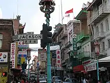 In the fall of 1863, Mohave chief Irataba created a storm when he walked down Jackson Street, dressed in what Arthur Woodward described as "the full civilized costume" typical of European Americans, which Irataba soon preferred to traditional Mohave clothing.[1] The press documented his every movement and wrote extensively about his physical size and strong features.[2] In February 1894, the two cable car lines on the street were extended.[3] In the 1990s, the Jackson Street Boys criminal gang gained notoriety.