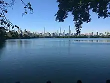 For several months, Central Park's commissioners faced delays and resistance from the New York City common council while attempting to gain funding.[10]:477[11] A dedicated work force and funding stream was not secured until June 1858.[10]:477 The landscaped Upper Reservoir was the only part of the park that the commissioners were not responsible for constructing; instead, the Reservoir would be built by the Croton Aqueduct board. Work on the Reservoir started in April 1858.[12] The southern section of Central Park below 79th Street was mostly completed by 1860,[13] and the Croton Aqueduct board also started filling in the Reservoir around this time.[12] The Upper Reservoir was finished by 1862.[4] An 1875 map of Central Park clearly shows the Lower and Upper reservoirs.[14]