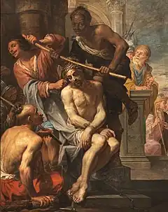 The compositions currently ascribed to de l’Ange include religious and mythological subjects as well as historical subjects and allegorical genre scenes. Examples of the former include the Chained Prometheus (Lempertz, 19 May 2007, Cologne, lot 1085) and The Holy Family (Noordbrabants Museum, 's-Hertogenbosch). The latter composition has been ascribed previously to Abraham van Diepenbeeck and Pieter van Lint.[9] His history paintings further include the Martyrdom of St Dymphna and St Gerebernus (Staatsgalerie im neuen Schloss Schleissheim, Oberschleissheim), formerly attributed to Gerard Seghers and two versions of the Death of Seneca (private collections), one of which was formerly attributed to 'Circle of Matthias Stom.[10][11]