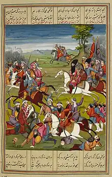 ![]() Fath-Ali Shah's defeat of Jafar Qoli Khan Donboli and Mohammad Qoli Khan, folio from the Shahinshahnama of Fath-Ali Khan Saba, dated 1810 | |