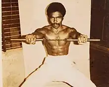 Jaguar Thangam started learning Silambam at the age of 6. From then till now, he has been the only person in the film industry who has mastered 27 kinds of stunt arts.[4]