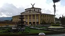 The park contains replicas of the Taj Mahal in India, as well as replicas of the Seven Wonders of the Ancient World.[4] It also has several monuments, including a large hand holding a globe, which is the emblem of the park, meant to represent the hand of God. Inside the replica of Taj Mahal, there are reproductions painted in ceramic of great works of world art and the Cyclorama of Colombian Independence (in Spanish: Ciclorama de la Independencia Colombiana), a 165-meter-long and 7-meter-high mural that represents the entire process of that country's independence since the Revolution of the Comuneros in 1781, the Cry of Independence and the Battles of the Vargas Swamp and the Boyacá Bridge in 1819.[5][6][7]