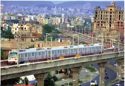 The Jaipur Metro (Hindi: जयपुर मेट्रो) is a rapid transit system in the city of Jaipur, Rajasthan, India.[6] Construction on the mostly elevated part of the first line, called Phase 1A, comprising 9.63 kilometres (5.98 mi) of route from Mansarovar to Chandpole Bazaar,[1] started in November 2010,[7] and was completed in 2014. The Jaipur Metro began commercial service between Chandpole and Mansarovar on 3 June 2015.[5] The Jaipur Metro Rail system is India's sixth metro rail system after those in Kolkata, Delhi, Bangalore, Gurugram and Mumbai. The Jaipur Metro is the first metro in India to run on triple-storey elevated road and metro track. Phase 1-B, from Chandpole to Badi Chaupar, began operation on 23 September 2020.[8][9]