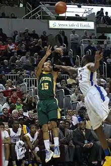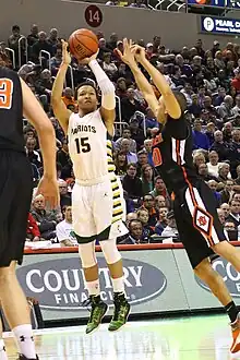 Brunson opened the season in the starting lineup with 12 points and 4 assists against the Fairleigh Dickinson Knights on November 13.[70] On November 26 in the semi-finals of the NIT Season Tip-Off against Stanford, Brunson posted 18 points.[71] On December 28, he posted a then career-high 22 points against Penn.[72][73] The 22-point effort was part of a 3–0 week for Villanova in which Brunson averaged 15.3 points and earned Big East Freshman of the Week.[74] On February 8, the 2015–16 Wildcats became the first Villanova Wildcats men's basketball team to reach number one in the AP Poll by climbing to the top of the 2015–16 NCAA Division I men's basketball rankings.[75] Following the 2015–16 Big East season, he was a unanimous Big East All-Freshman Team selection.[76] In the 2016 NCAA Division I men's basketball tournament regional final against Kansas Brunson made the final two free throws that gave the Wildcats a two-possession lead with 3.5 seconds left.[77] The 2015–16 Wildcats won the championship game of the tournament by defeating the North Carolina Tar Heels 77–74, with Brunson as a starter.[78][79]