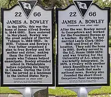 James Alfred Bowley (c.1844 – January 30, 1891) was a teacher, lawyer, judge, school commissioner,[1] politician, and newspaper publisher in South Carolina.[2] He escaped slavery in Maryland with help from Harriet Tubman. He served in the U.S. Navy. After the American Civil War he moved to Georgetown, South Carolina taught in schools and was elected to the South Carolina House of Representatives. His former home in Georgetown, South Carolina, where he lived with his wife Laura Clark (1854–1932), is a historic site.[3]