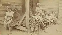 While documenting scenes from black communities, Palmer mostly stayed away from any kind of political commentary. He gave his images simple and descriptive titles.[6] However, there were also times in his career when he used his platform to champion the political rights of African-Americans, or, at the very least, to draw sympathy for them. In 1874, he took a stereograph of a poor black family he entitled "The way the negro race is dying out."[11] He titled another image of children from the same family " We are all, all hue."[12]